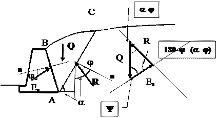 Кулон рассматривал эту задачу на основе уравнения статики. 1. Вес АВС – можно найти с любой заданной точностью Q; 2. По стороне АС действует реактивное давление R, jо – угол трения между грунтом и поверхностью стенки; 3. Еа – активное давление грунта; 4. Строим многоугольник сил, который должен быть замкнутым в условиях равновесия, и вычисляем соотношения: