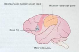 ОТРАЖЕННАЯ РЕАЛЬНОСТЬ В ходе опытов на обезьянах авторы статьи обнаружили особые популяции нейронов, расположенные в моторных областях мозговой коры (справа), работа которых тесно связана с выполнением животными определенных действий и узнаванием тех же движений, выполняемых лаборантом. Поскольку активность зеркальных клеток показывала, что животные различали и цели происходящего, исследователи заключили, что зеркальный механизм мозга связан с пониманием смысла поступков. Зеркальные нейроны по-разному реагировали на одинаковые действия лаборанта, осуществляемые с разными намерениями, т.е. эти клетки обеспечивали также понимание животными окончательных целей происходящего