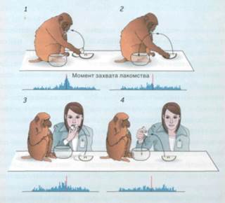 РАЗЛИЧЕНИЕ ЦЕЛЕЙ Зеркальный нейрон зоны F5 активировался, когда обезьяна наблюдала, как рука лаборанта тянется к угощению (/). Однако если лакомства не было, аналогичный жест не вызывал активации зеркальной клетки (2). Клетка реагировала на целенаправленное движение руки и в том случае, когда животное знало, что за непрозрачным экраном находится еда, но не видело ее (3). Если же обезьяна знала, что ничего съедобного за экраном нет, отмечалась слабая активация нейрона (4) РАСПОЗНАНИЕ НАМЕРЕНИЙ Зеркальный нейрон нижней теменной области обнаруживал высокую активность, когда обезьяна брала фрукт, чтобы поднести его ко рту (1). Реакция нейрона была слабее, если животное намеревалось переложить плод в сосуд (2). Клетка обнаруживала высокую степень возбуждения и в том случае, когда примат наблюдал, как лаборант берет лакомство и подносит его ко рту (3), и слабую импульсацию, когда он помещал кусочек в сосуд (4). Во всех случаях реакции клетки были связаны с захватом лакомства, соответственно, первоначальная активация нейрона кодировала понимание конечного намерения действия