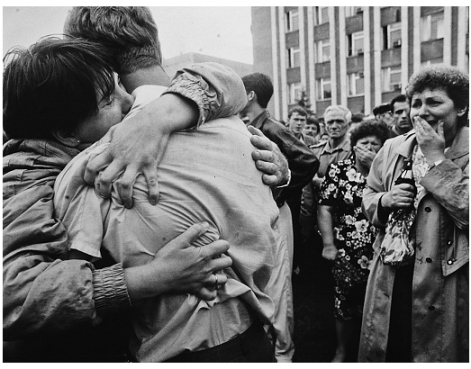 – Аллах Акбар! Ура! – врезалось в ее сон. Наташа проснулась. Колонна въехала в Хасавюрт и встала на площади, где ее ждало людское море. Наташа смотрела из окна и не могла даже предположить, сколько здесь собралось людей – тысяча, две, три? В воздухе развивались зеленые флаги. Толпа волновалась белыми тюбетейками, сотнями рук, вскинутых в приветственном крике. Дагестанцы встречали колонну, как когда-то вся страна с восторгом и транспарантами выходила на встречу воинам-освободителям. Басаев вышел на ступеньку автобуса. Поднял вверх руку, сжатую в кулак, и закричал: «Аллах Акбар!» Море дагестанцев вздыбилось поднятыми кулаками, и над площадью раскатилось в тысячи раз усиленное басаевское эхо: «Аллах! Акбар!» У Наташи по спине поползли мурашки. – Аллах Акбар! – кричал Басаев. – Аллах! Акбар! – повторяла толпа, и волна слившихся воедино мужских и женских голосов, но в основном мужских, накатывала на передние ряды, с силой обрушивалась на автобусы, заставляя гудеть металл, а потом колеблющим воздух эхом отступала назад к задним рядам. Они встречают Басаева, как рабочие и крестьяне в красные времена встречали Ленина, думала Наташа. Басаев снял панаму, яркое утреннее солнце отразилось на его лысеющей голове. Он по-сыновьи принимал объятия стариков – дагестанских аксакалов в лохматых папахах. Они опирались посохами о подножку автобуса, а он прижимался к ним разгрузочным жилетом. Вдалеке за толпой зеленели деревья, волновалась листва – где-то рядом было Каспийское море, и волны в белых пенных тюбетейках гнали к площади легкий ветер. Наташа мечтала о Мальдивских островах. «Остановим войну!» – поднимали дагестанцы транспаранты. Мужчины в легких рубашках заносили в автобус ведра черешни, мясо, хлеб, сигареты. – Ешьте, – обнимали они заложников. – Ешьте. – Ого, сколько жрачки, – тихонько присвистнула Наташа. Колонну охранял дагестанский ОМОН, и, выглянув в окно, можно было увидеть, как чеченские боевики делятся с омоновцами патронами. ОМОН водил заложников в туалет – под конвоем, чтоб не сбежали. Журналистов не охраняли, итак было понятно – эти от своего события никуда не убегут. Наташа схватила из ведра горсть черешни и вышла из автобуса, повесив фотоаппарат на плечо. Утренняя прохлада сменялась летним зноем. Металл автобуса набирал жар, теплел под ее рукой, когда она прикасалась к его пыльным стенкам. Она медленно прошла по теплому асфальту, выстреливая в него скользкими черешневыми косточками. Дошла до соседнего автобуса, он ехал четвертым или пятым в колонне. Поднялась на первую ступень, заглянула... – Тварь! Пятки сами потянули ее назад – со ступеньки на землю. Одной секунды хватило ей для того, чтобы понять – внутри был ад. Она оцепенела, прислонившись к автобусу спиной. Надо было бежать, но ноги наливались тяжестью. Внизу живота защемило, ей нужно было в туалет. Обняв фотоаппарат, она пошла к первому автобусу, туда, где мужчины и женщины, расчистив в толпе круг, танцевали лезгинку. Она смотрела на них, но видела не их. Играла музыка, откуда-то из динамиков она лилась, национальная зажигательная, мужчины кричали: «Аса! Асса!» Хлопали в ладоши, выводили женщин из толпы, и те, опустив головы, разведя руки, пальцами щупая воздух, мелкими шажками притопывали за ними по асфальту. Где здесь туалет? – Что с тобой опять случилось? – Басаев вытирал лиц