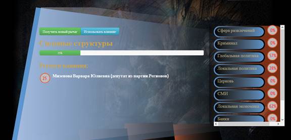 Кликнув на картинку глобальной сферы влияний (например «политика») вы можете увидеть на какие области вы влияете и сколько очков влияний имеется в каждой из них. Если у вас нет рычагов в нужной области – нажмите «получить влияние» чтобы отправить заявку на получение рычага.