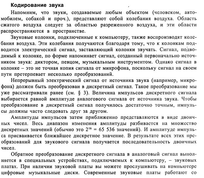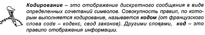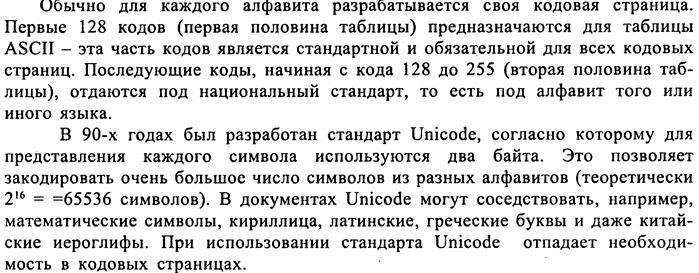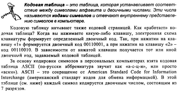 А теперь познакомимся с другим способом измерения информации. Этот способ не связывает количество информации с содержанием сообщения, и называется он алфавитным подходом. При алфавитном подходе к определению количества информации отвлекаются от содержания информации и рассматривают информационное сообщение как последовательность знаков определенной знаковой системы. Проще всего разобраться в этом на примере текста, написанного на каком-нибудь языке. Для нас удобнее, чтобы это был русский язык. Все множество используемых в языке символов будем традиционно называть алфавитом. Обычно под алфавитом понимают только буквы, но поскольку в тексте могут встречаться знаки препинания, цифры, скобки, то мы их тоже включим в алфавит. В алфавит также следует включить и пробел, т.е. пропуск между словами. Полное количество символов алфавита принято называть мощностью алфавита. Будем обозначать эту величину буквой N. Например, мощность алфавита из русских букв и отмеченных дополнительных символов равна 54. Представьте себе, что текст к вам поступает последовательно, по одному знаку, словно бумажная ленточка, выползающая из телеграфного аппарата. Предположим, что каждый появляющийся на ленте символ с одинаковой вероятностью может быть любым символом алфавита. В действительности это не совсем так, но для упрощения примем такое предположение. В каждой очередной позиции текста может появиться любой из N символов. Тогда, согласно известной нам формуле, каждый такой символ несет I бит информации, которое можно определить из решения уравнения: 2I = 54. Получаем: I = 5.755 бит. Вот сколько информации несет один символ в русском тексте! А теперь для того, чтобы найти количество информации во всем тексте, нужно посчитать число символов в нем и умножить на I. Посчитаем количество информации на одной странице книги. Пусть страница содержит 50 строк. В каждой строке — 60 символов. Значит, на странице умещается 50x60=3000 знаков. Тогда объем информации будет равен: 5,755 х 3000 = 17265 бит. При алфавитном подходе к измерению информации количество информации зависит не от содержания, а от размера текста и мощности алфавита. При использовании двоичной системы (алфавит состоит из двух знаков: 0 и 1) каждый двоичный знак несет 1 бит информации. Интересно, что сама единица измерения информации «бит» получила свое название от английского сочетания «bi nary digi t» - «двоичная цифра». Применение алфавитного подхода удобно прежде всего при использовании технических средств работы с информацией. В этом случае теряют смысл понятия «новые — старые», «понятные — непонятные» сведения. Алфавитный подход является объективным способом измерения информации в отличие от субъективного содержательного подхода. Удобнее всего измерять информацию, когда размер алфавита N равен целой степени двойки. Например, если N=16, то каждый символ несет 4 бита информации потому, что 24 = 16. А если N =32, то один символ «весит» 5 бит. Ограничения на максимальный размер алфавита теоретически не существует. Однако есть алфавит, который можно назвать достаточным. С ним мы скоро встретимся при работе с компьютером. Это алфавит мощностью 256 символов. В алфавит такого размера можно поместить все практически необходимые символы: латинские и русские буквы, цифры, знаки арифметических операций, всевозможные скобки, знаки п