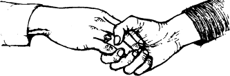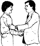 Рис. 30. Пожатие кончиков пальцев. имеющими более широкую интимную зону. Сельчане, однако, при этом будут наклоняться вперед или даже балансировать на одной ноге. Пожатие кончиков пальцев напоминает пожатие прямой не согнутой рукой, невыполненное до конца: вместо руки, по ошибке, в ладонь заключаются только пальцы. Даже если инициатор приветствия дружелюбно настроен по отношению к реципиенту, фактически он не уверен в себе. Как и в предыдущем случае, цель этого рукопожатия заключается в том, чтобы держать партнера на удобном для себя расстоянии.