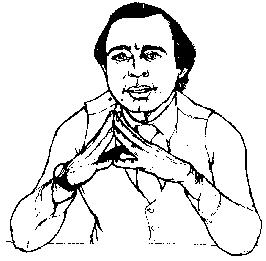 Рис.39. Нижнее положение сцепленных рук. Существует зависимость между положением рук и силой негативного чувства, испытываемого человеком, то есть, с человеком труднее будет договориться в случае, если его руки подняты так, как показано на рис.37, чем на рис.38. Для расслабления этого негативного жеста нужно предпринять ряд мер, позволяющих человеку вытянуть руки вперед и обнажить ладони, иначе будет присутствовать враждебная нотка в процессе переговоров. Шпилеобразное Положение Рук. В самом начале я уже упоминал о том, что жесты не существуют изолированно друг от друга, а тесно связаны с другими жестами и микрожестами, как слова в предложении, поэтому интерпретировать их нужно с учетом обстоятельств, в которых они используются. "Шпилеобразное", как назвал его Бердвисл, положение рук может быть исключением из этого правила, потому что оно часто используется изолированно от других жестов. И действительно, этим жестом часто пользуются уверенные в себе люди, лица, занимающие руководящие должности, или люди с ограниченной жестикуляцией. Используя этот жест, они передают информацию своей самоуверенностью. Мои наблюдения и исследования этого обворожительного жеста показывают, что он очень часто используется в условиях субординации и может быть изолированным жестом, обозначающим уверенную или "всезнающую" позицию. Люди управляющего звена часто применяют этот жест, когда отдают распоряжения или советы своим подчиненным, он очень распространен среди бухгалтеров, юристов, менеджеров и тому подобное. Этот жест имеет два варианта: руки шпилем вверх (рис.40) и руки шпилем вниз (рис.41). Первое положение обычно принимается тогда, когда говорящий выражает свое мнение или излагает свои идеи. Второе положение используется тогда, когда человек не говорит, а слушает. Ниберенберг и Калеро заметили, что женщины чаще используют положение рук шпилем вниз, чем шпилем вверх. Когда при положении рук шпилем вверх у говорящего голова откинута назад, у него появляется налет самодовольства и высокомерия. Хотя в целом шпилеобразный жест расценивается как положительный сигнал, он может быть использован как при положительных, так и при отрицательных обстоятельствах, и поэтому может быть неправильно истолкован. Например, агент по продаже, предлагающий свой товар потенциальному покупателю, может обратить внимание на ряд положительных жестов, поступивших от покупателя во время переговоров. Это могут быть и обнаженные ладони, и наклон вперед, и поднятая вверх голова и т.д. Допустим, что к концу переговоров клиент делает шпилеобразный жест. Если за этим жестом, в ответ на предложение агента дать свое решение, последует серия положительных жестов, агент получит сигнал о том, что можно завершить переговоры, спрашивать о заказе и быть уверенным в том, что он последует. С другой стороны, если за шпилеобразным жестом (особенно, если он был сделан в конце презентации товара) последует ряд негативных жестов, таких как скрещивание рук на груди, закидывание ноги на ногу, бегающий взгляд и многочисленные жесты, связанные с манипуляцией рук у лица, то это говорит о том, что покупатель принял твердое решение не покупать этот товар и хочет избавиться от агента по продаже. В обоих случаях "шпиль-жест" означает уверенность в себе, но один имеет положительное значение, а другой 