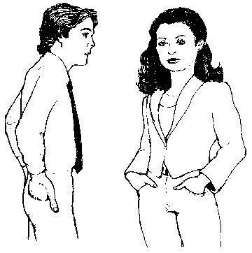 Рис.47. Большие пальцы рук выглядывают из задних карманов брюк. Рис.48. Доминантная поза женщины. Другой популярный жест - скрещенные на груди руки с вертикально выставленными большими пальцами рук. Этот жест передает двойной сигнал - первый о негативном или оборонном отношении (скрещенные руки) плюс чувство превосходства (выраженное большими пальцами рук). Человек, прибегающий к этому жесту, обычно поигрывает одним или обоими пальцами, а для стоячего положения характерно покачивание на каблуках.