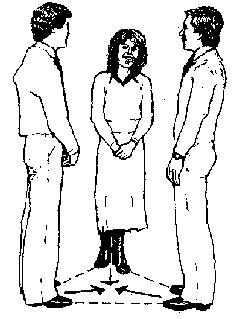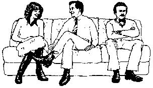 Рис.136. Открытая треугольная позиция. является невербальным приглашением к третьему человеку присоединиться к ним, встав на место этой третьей точки. Эти два человека на рисунке демонстрируют равенство социального положения, что видно из их одинаковых жестов и позы, а угол, под которым тела повернуты друг другу, указывает на непринужденный характер их беседы. Образование треугольника приглашает третьего человека, равного в социальном отношении, присоединиться к их разговору. Если в компанию принимается четвертый человек, то образуется квадрат, а если пятый, то формируются два треугольника или круг. Закрытые Позиции. Когда требуется установить отношения собственности или интимности, то угол между телами уменьшается до нуля градусов.