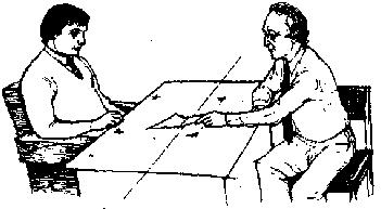 Рис.150. Конкурирующе-оборонительная позиция. дать возможность А почувствовать его превосходство, он может специально сесть напротив А. Каким бы бизнесом вы не занимались, если он связан со взаимоотношениями людей, вам необходимо знание различных средств воздействия на людей. Вашей целью должно быть понимание точки зрения других, создание непринужденной атмосферы в процессе взаимодействия и умение убедить клиента, что вы для него нужный человек. А конкурентная позиция не годится для этих целей. Большее взаимопонимание будет достигнуто через угловое положение и позицию делового сотрудничества, чем через конкурирующую позицию. Разговор в такой позиции должен быть коротким и специфичным. Когда люди сидят напротив друг друга, они подсознательно делят стол на две равные территории. "Каждый претендует на свою собственную территорию и будет защищать ее в случае посягательств. В ресторане два человека, сидящих за столом друг против друга, отмечают свою территорию различными объектами - будь то соль, перец, сахарница или салфетка. Здесь приводится простой тест, который вы можете провести в ресторане. Он показывает, как человек реагирует на вторжение в свою территорию. Недавно я пригласил в ресторан агента по продаже, рассчитывая предложить ему контракт с нашей фирмой. Мы сидели за небольшим прямоугольным столом, таким небольшим, что я не мог занять угловую позицию и вынужден был сидеть в конкурирующей позиции. На столе находились обычные столовые принадлежности: солонка, перечница, пепельница, салфетки и меню. Я взял меню, прочитал его и затем положил его на то место, где была территория моего собеседника. Он взял его, прочитал и положил в центр стола справа от себя. Я затем снова взял меню, еще почитал его и снова положил меню на его территорию. До этого момента он сидел слегка нагнувшись вперед, а мое маленькое вторжение заставило его откинуться назад. Пепельница стояла в центре стола, я же, стряхивая пепел, слегка подтолкнул ее на его территорию. Когда он стряхивал пепел со своей сигареты, он снова подвинул пепельницу в центр стола. Затем я снова, как бы случайно, подвинул пепельницу на его сторону. Затем я медленно передвинул сахарницу с центра стола на его сторону, и он стал проявлять признаки беспокойства. Таким же образом я передвинул подставку для соли и перца. К этому времени он уже сидел, как на углях, и на лбу у него выступили капельки пота. Когда я передвинул на его сторону салфетки, это было последней каплей. Он не вынес этого, встал, извинился и вышел в туалет. По его возвращении, я извинился и вышел из-за стола. Когда я вернулся, я увидел, что все принадлежности были аккуратно передвинуты на центральную линию! Эта простая, но эффективная игра показывает, как человек оказывает сопротивление человеку, который вторгается на его территорию. Таким образом, становится понятным, почему следует избегать конкурирующей позиции при переговорах или обсуждении. Бывают случаи, когда очень трудно или неуместно занимать угловую позицию при предъявлении своего материала. Предположим, что вам нужно предъявить книгу, образец или схему на рассмотрение человеку, сидящему за прямоугольным столом. Сначала положите то, что вы хотите предъявить на центральную линию стола (рис.151). Другой человек наклонится вперед и станет разглядывать ваш объект, 