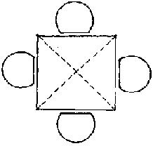 Рис.154. Независимая позиция. Круглые, Квадратные и Прямоугольные Столы. Квадратный Стол (Официальный). Как ранее отмечалось, квадратный стол способствует созданию отношений соперничества и вызывающего поведения людей, равных по положению. Квадратные столы хороши для проведения короткой, деловой беседы или для подчеркивания отношений субординации. Отношения сотрудничества скорее устанавливаются с тем человеком, который сидит за столом рядом с вами, причем от человека, который сидит справа от вас, будет исходить больше понимания, чем от того, кто сидит слева. Наибольшее сопротивление будет оказывать тот, кто сидит прямо напротив вас.