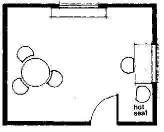 Рис.156. Круглый неофициальный стол. Следовательно, рыцарь, сидящий прямо напротив короля Артура, фактически находился в конкурентно-защитной позиции и, возможно, был одним из тех, кто доставлял королю Артуру больше всех беспокойства. В сфере бизнеса часто используются квадратные и круглые столы. Квадратный стол, который обычно является рабочим столом, используется для деловых переговоров, брифингов, для отчитывания провинившихся и тому подобное. Круглый стол, чаше всего это стол со стульями-вертушками, служит созданию непринужденной, неофициальной атмосферы и хорош в том случае, если вам нужно достичь соглашения. Прямоугольный Стол. За прямоугольным столом место А считается главенствующим. На встрече людей одинакового социального статуса человек, сидящий на месте А, будет оказывать максимум влияния, при условии, если он не сидит спиной к двери. Если А будет сидеть спиной к двери, главенствующее положение перейдет к В, который станет соперником