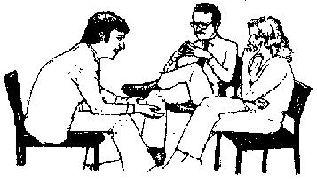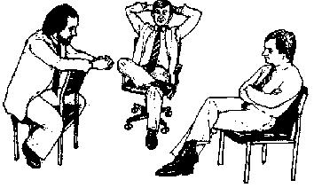 Рис.173. Рисунок 174. Человек слева демонстрирует превосходный букет жестов, передающих доверие, открытость и честность. Это протянутые ладони, выдвинутая вперед нога, поднятая голова, расстегнутый пиджак, расставленные руки и ноги. Он наклоняется вперед и улыбается. К несчастью, его позиция не находит отклика у присутствующих. Женщина сидит глубоко откинувшись на спинку стула и перекинув ногу за ногу (оборонная позиция), она использует правую руку как частичный барьер (оборонная поза). Ее стиснутые кулаки свидетельствуют о враждебном отношении. Голова наклонена вперед, и женщина прибегает еще к жесту критической оценки (рука под щекой). Мужчина в середине использует шпилеобразный жест, указывающий, что он чувствует себя уверенно и выше других. Сидит он, положив ногу на колено другой ноги, демонстрируя свое критическое отношение. Общая поза - негативная, т.к. он сидит, откинувшись назад со склоненной головой.
