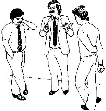 Рис.170. Рисунок 171. Человек справа и человек слева образовали закрытую диспозицию, чтобы показать человеку в центре, что он не принят в их компанию. Человек в середине относится к другим с чувством превосходства и сарказмом, что видно из его жестов - одна рука держится за лацкан пиджака, а палец этой руки отставлен вверх (чувство превосходства), В дополнение к этому высмеивающий жест в сторону человека, стоящего слева, заставил его отреагировать оборонительной позой (скрещенные ноги), а также агрессивным жестом - заложенные руки за спину при одной руке, захватывающей предплечье другой (самообладание); характерен также и взгляд искоса. Человек слева также не в восторге от поведения человека посередине. Он скрестил ноги (оборонная поза), рука в кармане (нежелание соучаствовать), взгляд в пол и потирание шеи рукой.
