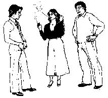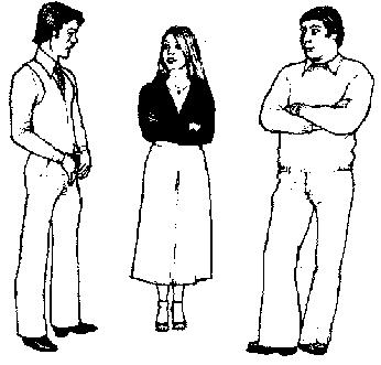 Рис.175. Рисунок 176. Невербальная ситуация изменилась. Женщина распрямила ноги и стоит в нейтральной позиции. Мужчина слева тоже распрямил свои ноги и поставил одну ногу носком в сторону женщины (интерес). Он заложил большие пальцы обеих рук за пояс брюк, если этот жест предназначается мужчине, он трактуется как агрессивный. Если же он предназначается женщине, то становится сексуальным жестом. Он также выпрямился, чтобы казаться выше. Мужчина справа, кажется, смущен поведением первого мужчины, что видно из того, что он сильно выпрямился, бросает косые взгляды на мужчину слева: брови его опущены (неодобрение), а улыбка пропала.