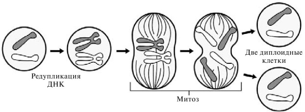 Приблизительно в центре клетки находится довольно крупное округлое образование – клеточное ядро, окруженное собственной двойной мембраной и заполненное вязкой жидкостью – кариоплазмой. Внутри ядра лежит тельце поменьше – ядрышко. А вот хромосомы – своего рода командный пункт – без помощи электронного микроскопа не разглядеть: они становятся видимыми, когда клетка начинает подготовку к делению. Но вот клетка приступила к митозу. Внутри ядра образовался рыхлый клубок длинных перепутанных нитей – произошла спирализация хромосом. Теперь они хорошо заметны в обычный световой микроскоп. Нити медленно и хаотично движутся, постепенно становясь все короче и толще. Рассосалась ядерная мембрана, исчезло ядрышко. Хромосомы, ставшие совсем короткими и плотными, выходят в цитоплазму и располагаются в экваториальной плоскости клетки, выстроившись в цепочку. Затем они расщепляются вдоль – их количество удвоилось. Теперь сестринские хромосомы лежат параллельно друг другу.