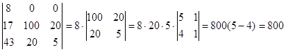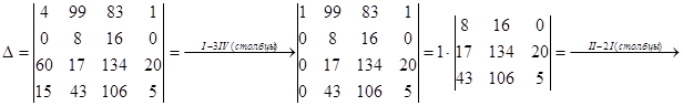 Из линейного свойства определителя следует, что определитель суммы двух квадратных матриц одного и того же порядка n A=(aij) и B=(bij) равен сумме всех различных определителей порядка n, которые могут получиться, если часть строк (столбцов) брать совпадающими с соответствующими строками (столбцами) матрицы А, а остальную часть – совпадающими с соответствующими строками (столбцами) В. Определитель произведения двух квадратных матриц равен произведению их определителей: Из этого свойства следует, что даже если Пример. Формулу для разложения определителя наиболее удобно использовать по тем строкам (столбцам), в которых большинство элементов равны 0.. Так, если в данной строке только один элемент отличен от нуля, то разложение по этой строке содержит только одно слагаемое и вопрос о вычислении определителя порядка n сводится к вычислению определителя порядка (n-1). Вычислим следующий определитель, применяя свойства к столбцам.