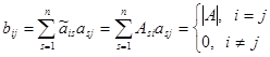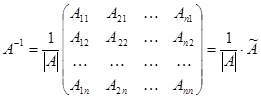 Обратная матрица. Пусть А – квадратная матрица порядка n, а Е – единичная матрица того же порядка. Матрица В называется правой обратной по отношению к матрице А, если АВ=Е. Матрица С называется левой обратной по отношению к матрице А, если СА=Е. Т.к. обе матрицы А и Е являются квадратными порядка n, то матрицы В и С (если они существуют) также являются квадратными матрицами порядка n. Убедимся, что если обе матрицы В и С существуют, то они совпадают между собой на основании равенств АЕ=А, АВ=Е, СА=Е и сочетательного свойства произведения матриц: С=СЕ=С(АВ)=(СА)В=ЕВ=В. Т.о., правая и левая обратные матрицы совпадают В=С=А-1 Определение. Матрица А-1 называется обратной по отношению к матрице А, если при умножении этой матрицы на данную как справа, так и слева получается единичная матрица: АА-1=А-1А=Е. Если Но не каждая квадратная матрица имеет обратную. Если для существования числа а-1, обратного для числа а, необходимым и достаточным условием является Теорема 1 (критерий существования обратной матрицы). Квадратная матрица А имеет обратную матрицу тогда и только тогда ( Доказательство. Необходимость. Пусть матрица А имеет обратную матрицу А-1. Покажем, что в этом случае А невырожденная. АА-1=А-1А=Е. Тогда по свойству определителей имеем: Достаточность. Пусть Рассмотрим квадратную матрицу n-го порядка У обеих матриц С и В любой элемент, не лежащий на главной диагонали, равен нулю, т.к., например, (по свойствам определителя Следовательно В (ровно как и С) – диагональная матрица, элементы главной диагонали равны определителю матрицы А: Значит, если в качестве обратной матрицы взять матрицу