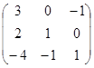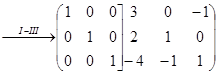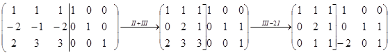 1) Отбрасывание нулевой строки (столбца). 2) Умножение всех элементов строки (столбца) на число, отличное от нуля. 3) Перемена местами двух строк (столбцов) местами. 4) Прибавление к элементам одной строки (столбца) соответствующих элементов другой строки (столбца), умноженных на любое число. 5) Транспонирование матрицы. Матрица В, полученная из матрицы А с помощью элементарных преобразований, называется эквивалентной матрице А (В~А). При помощи элементарных преобразований можно найти обратную матрицу к невырожденной матрице А. Метод элементарных преобразований (метод Гаусса). Приписывая справа к квадратной матрице А порядка n единичную матрицу такого же порядка. Получим прямоугольную матрицу В=(А|Е) размера nx2n. С помощью элементарных преобразований над строками матрицы В приведем ее к виду (Е|А-1). Пример. А=
