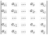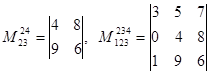 или Т.о. строка еm является линейной комбинацией остальных строк. Ч.т.д. Достаточность. Пусть одна из строк, например еm, является линейной комбинацией остальных строк. Тогда найдутся числа где хотя бы 1 из коэффициентов, (-1), не равен нулю. Т.е. строки линейно зависимы. Ч.т.д. Определение. Минором k-го порядка матрицы А размера mxn называется определитель k-го порядка с элементами, лежащими на пересечении любых k строк и любых k столбцов матрицы А. (k≤min(m,n)). Пример. миноры 2-го порядка: У матрицы 3-го порядка 9 миноров 1-го порядка, 9 миноров 2-го порядка и 1 минор 3-го порядка (определитель этой матрицы). Определение. Рангом матрицы А называется наивысший порядок отличных от нуля миноров этой матрицы. Обозначение - rg A или r(A). Свойства ранга матрицы. 1) ранг матрицы Anxm не превосходит меньшего из ее размеров, т.е. r(A)≤min(m,n). 2) r(A)=0 3) Для квадратной матрицы А n –го порядка r(A)=n (Ранг диагональной матрицы равен количеству ее ненулевых диагональных элементов). 4) Если ранг матрицы равен r, то матрица имеет хотя бы один минор порядка r, не равный нулю, а все миноры больших порядков равны нулю. Для рангов матрицы справедливы следующие соотношения: 1) r(AT)=r(A) 2) r(A+B)≤r(A)+r(B); 3) r(AB)≤min{r(A),r(B)}; 3) r(A+B)≥│r(A)-r(B)│; 4) r(ATA)=r(A); 5) r(AB)=r(A), если В - квадратная невырожденная матрица. 6) r(AB)≥r(A)+r(B)-n, где n-число столбцов матрицы А или строк матрицы В. Определение. Ненулевой минор порядка r(A) называется базисным минором. (У матрицы А может быть несколько базисных миноров). Строки и столбцы, на пересечении которых стоит базисный минор, называются соответственно базисными строками и базисными столбцами. Теорема 2 (о базисном миноре). Базисные строки (столбцы) линейно независимы. Любая строка (любой столбец) матрица А является линейной комбинацией базисных строк (столбцов). Доказательство. (Для строк). Если бы базисные строки были линейно зависимы, то по теореме (1) одна из этих строк была бы линейной комбинацией других базисных строк, тогда, не изменяя величины базисного минора, можно вычесть из этой строки указанную линейную комбинацию и получить нулевую строку, а это противоречит тому, что базисный минор отличен от нуля. Т.о. базисные строки линейно независимы. Докажем, что любая строка матрицы А является линейной комбинацией базисных строк. Т.к. при произвольных переменах строк (столбцов) определитель сохраняет свойство равенства нулю, то, не ограничивая общности, можно считать, что базисный минор находится в верхнем левом углу матрицы А=