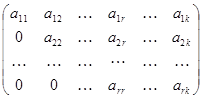 Если j£r или i£r, то этот определитель равен нулю, т.к. у него будет два одинаковых столбца или две одинаковых строки. Если же j>r и i>r, то этот определитель является минором (r+1)-го порядка матрицы А. Т.к. ранг матрицы равен r, значит любой минор большего порядка равен 0. Раскладывая его по элементам последнего (добавленного) столбца, получаем a1jA1j+a2jA2j+…+arjArj+aijAij=0, где последнее алгебраическое дополнение Aij совпадает с базисным минором Мr и поэтому Aij= Мr≠0. Разделив последнее равенство на Aij, можем выразить элемент aij, как линейную комбинацию: Зафиксируем значение i (i>r) и получаем, что для любого j (j=1,2,…,n) элементы i-й строки ei линейно выражаются через элементы строк е1, е2,…,еr, т.е. i-я строка является линейной комбинацией базисных строк: Теорема 3. (необходимое и достаточное условие равенства нулю определителя). Для того, чтобы определитель n-го порядка D был равен нулю, необходимо и достаточно, чтобы его строки (столбцы) были линейно зависимы. Доказательство (с.40). Необходимость. Если определитель n-го порядка D равен нулю, то базисный минор его матрицы имеет порядок r<n. Тогда хотя бы одна из его строк является не базисной. По теореме 2 эта строка является линейной комбинацией базисных строк. В эту линейную комбинацию можно включить и все оставшиеся строки с коэффициентами 0. Т.о., одна строка является линейной комбинацией других остальных. Тогда по теореме 1 строки определителя линейно зависимы. Достаточность. Если строки D линейно зависимы, то по теореме 1 одна строка Аi является линейной комбинацией остальных строк. Вычитая из строки Аi указанную линейную комбинацию, не изменив величины D, получим нулевую строку. Следовательно, по свойствам определителей, D=0. ч.т.д. Т.о. можно считать, что ранг матрицы равен максимальному числу ее линейно независимых строк или столбцов. Теорема 4. При элементарных преобразованиях ранг матрицы не меняется. Доказательство. Как было показано при рассмотрении свойств определителей, при преобразованиях квадратных матриц их определители либо не изменяются, либо умножаются на ненулевое число, либо меняют знак. При этом наивысший порядок отличных от нуля миноров исходной матрицы сохраняется, т.е. ранг матрицы не изменяется. Ч.т.д. Если r(A)=r(B), то А и В – эквивалентные: А~В. Теорема 5. При помощи элементарных преобразований можно привести матрицу к ступенчатому виду. Матрица называется ступенчатой, если она имеет вид: А= Условия r≤k всегда можно достигнуть транспонированием. Теорема 6. Ранг ступенчатой матрицы равен количеству ее ненулевых строк. Т.е. Ранг ступенчатой матрицы равен r, т.к. есть отличный от нуля минор порядка r: Date: 2015-09-02; view: 1290; Нарушение авторских прав |