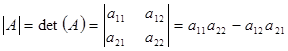 Определители Необходимость введения определителя – числа, характеризующего квадратную матрицу А, – тесно связано с решением систем линейных уравнений. Определитель матрицы А обозначается det (A) или Δ. Определителем матрицы первого порядка А=(а11), или определителем первого порядка, называется элемент а11: Δ = |А|=а11. Например, пусть А= (3), тогда Δ1 = |А|=3. Определитель матрицы второго порядка вычисляется по формуле: