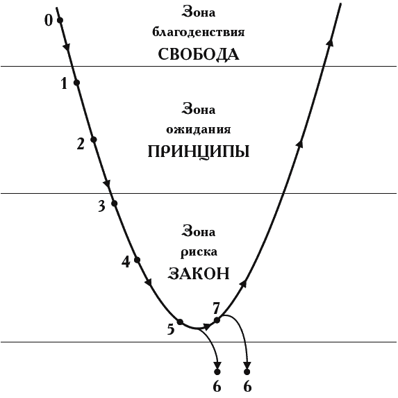 Для более наглядного представления вышеизложенной информации о вибрациях и зонах обратимся к рис. 1. На рисунке показаны три зоны, по которым условно распределяются люди, и парабола, с помощью которой можно легко понять, как происходит развитие болезней и выздоровление, нарастание проблем и выход из них.
