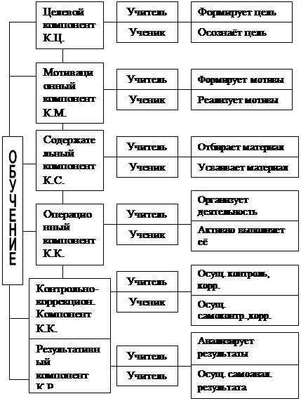 Сущность обучения. Обучение как общественное явление есть целенаправленная, организованная, систематическая передача старшим и усвоение подрастающим поколением опыта общественных отношений, результатов развития общественного сознания, культуры производительного труда, знаний об активном преобразовании и охране окружающей среды. Обучение обеспечивает преемственность поколений, полноценное функционирование общества и соответствующий уровень развития личности. В этом заключается его объективное назначение в обществе. Раскрыть сущность категории «обучение» – это значит: а) дать определение категории, назвав основные признаки; б) раскрыть содержание признаков обучения. Признаки категории «обучение»: 1. Целенаправленность. 2. Системность. 3. Двусторонность. Содержание признаков может быть раскрыто через компоненты процесса обучения.