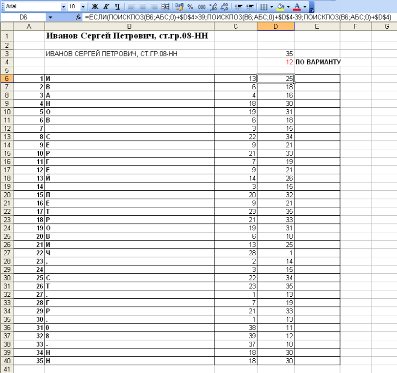 2. В ячейку В3 ввести формулу: ПРОПИСН (В1) 3. Заполнить столбец А: от 1 до 35 (количество символов в Ф. И.О. и группе студента). 4. В ячейку В6 ввести формулу: ПСТР (В$3; A6; 1). Затем скопировать ее до ячейки В40. 5/ В ячейку С6 ввести формулу: ПОИСКПОЗ (В6; АБС; 0). Скопировать далее. 6. В ячейку D6 ввести формулу: =ЕСЛИ (ПОИСКПОЗ (B6; АБС; 0) - $D$4<=0; ПОИСКПОЗ (B6; АБС; 0) - $D$4+39; ПОИСКПОЗ (B6; АБС; 0) - $D$4) 7. В ячейку Е6 ввести формулу: ИНДЕКС (АБС; D6) 8. В ячейку F6 ввести формулу: E6. В ячейку F7 ввести формулу: F6&E7 и скопировать. В результате получим ту фразу, которую шифровали, как показано на рисунке.