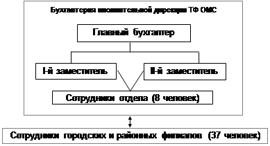 Помимо общей структуры управления ТФ ОМС существуют и организационные структуры отделов и служб внутри самой исполнительной дирекции. Они принимают участие в управлении не только кооперативно на уровне исполнительной дирекции по схеме, приведенной выше, но и самостоятельно принимают решения по специфическим вопросам, что возможно благодаря наличию прямой связи “отдел ИД — соответствующая служба филиала, ЛПУ или СМО”. Так, например, согласование тарифов на медицинские услуги осуществляется при непосредственном взаимодействии отдела ценообразования, представителя ЛПУ и СМО. Для демонстрации внутренней и внешней связи на рис. 5 показана оргструктура бухгалтерии исполнительной дирекции ТФ ОМС, которая отвечает за учет и отчетность по всему ТФ ОМС, но использует данные, полученные и обработанные местными службами. Отделы бухгалтерии в филиалах имеют небольшую численность персонала и простые оргструктуры и поэтому на схеме раздельно не показываются.
