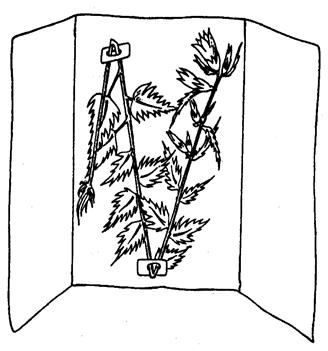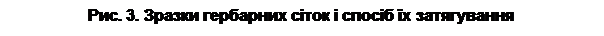 СУШІННЯ РОСЛИН Для сушіння рослини перекладають з тимчасової екскурсійної гербарної папки в сушильний прес, який складається з двох дошок або листків з фанери чи іншого міцного матеріалу розміром 45 x 30 см. У них роблять круглі великі дірки до 3 см. Фанерні дошки можна замінити дерев'яними рамами, на яких вздовж і впоперек натягнутий дріт так, що утворюється сушильна сітка з отворами 3 x 4, 4 x 4 см. Можна використати й інші гербарні преси, які є на кафедрі або ж придбані в торговій мережі. На одну дошку або сітку кладуть 3-5 аркушів газетного паперу, на якому старанно розправляють одну або кілька призначених для сушіння рослин. Розправляючи додатково рослини, слідкують, щоб на них не було зім'ятих листочків, а пагони не налягали один на одного. Віночки квіток повинні бути в такому положенні, в якому вони перебували під час повного цвітіння. Після цього рослину накривають 1-2 аркушами паперу, на який в такий же спосіб кладуть кілька нових рослин. Для кращого засушування між окремими видами рослин роблять додаткові прокладки чистого паперу чи газет (рис.3).