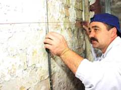 3.4 Устр-во маяков: Маяки устанавливаются для точного оштукатуривания стен. Можно применить имеющиеся в продаже специальные Т-образные профили, бруски или же установить гипсовые (из раствора) маяки. Маяки-лузги устрою следующим образом. Поверхности стен провешу, причем первые гвозди в углах набью с отступом от лузг на 2-3 см. На эти гвозди намажу раствор для марок, приставлю к маркам правило, и на него наброшу раствор. После схватывания раствора правило сниму, и в углах останутся два маяка, образующие точный ровный лузг. 3.5. Приготовление р-ра для оштуатуривания пов-ти: Приготовлю р-р в требуемых по конструкции пропорциях. Строительную смесь буду перемешивать в течении 5 минут, потом повторно перемешаю р-р перфоратором с максимальной частотой вращения - 600 об/мин. После чего раствор будет готов к применению 3.6 Нанесение и выравнивание раствора. Заглаживание пов-ти Между маяками набрызгом, с помошью штукатурной лопатки, нанесу штукатурный раствор - KNAUF Грюнбанд. Выравню его по двум маякам, движениями вверх-вниз при помощи правила, излишки снятые правилом сброшу обратно в ёмкость с раствором. После начала затвердевания раствора (приблизительно через пять часов), пов-ть затеру обильно смоченной губчатой тёркой, заглажу широким шпателем (350 мм). Эту операцию проделаю на всей пов-ти стены. Как только раствор схватится, верх бугорков срежу до уровня шляпок гвоздей, придавая маркам ровную поверхность. Боковые стороны срежу с четырех сторон, образуя квадрат со сторонами 3х3 или 4х4 см. Чем точнее устроены марки, тем точнее будут маяки, и наоборот. Когда все гипсовые маяки будут сняты, очищу пов-ть от пыли и грязи с помощью макловицы. Хорошо смочу кистью отбитые места и штукатурку рядом с отбитыми местами. Набрызгом с помощью штукатурной лопатки нанесу штукатурный раствор в вырубленные места. Нанесённый раствор хорошо притеру к пов-ти при помощи тёрки. После того, как штукатурка начала затвердевать, поверхность затеру обильно смоченной губчатой тёркой, после этого заглажу широким шпателем. Сразу же после окончания работы мою рабочие инструменты и оборудования. 3.7. Требования к качеству штукатурных работ: Точность выполнения различной штукатурки должна отвечать требованиям СНиП, которыми также обусловлена и толщина штукатурки. Толщина штукатурки должна отвечать следующим данным: Простая - до 12 мм. Улучшенная - до 15 мм. Высококачественная - до 20 мм. При приёмочном контроле производится проверка качества готовой оштукатуренной пов-ти. На готовой пов-ти должны отсутствовать трещины, следы от затирочного инструмента, наплывы раствора, пятна, раковины и т. п. При приёмочном контроле проверяется: · Прочность сцепления штукатурки с основанием оштукатуриваемых стен; · Отклонения оштукатуренной пов-ти от вертикали и горизонтали; · Отклонения радиуса криволинейной пов-ти; · Отклонения ширины откосов от проектной.