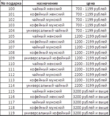 И креативные и матричные подарки выставляются по общей схеме по ценовым группам. Ниже представлена матрица подарков: