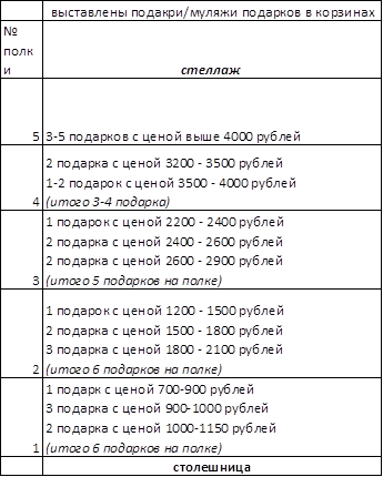 Выкладка готовых подарков. При выкладке подарков в стеллажах учитываются следующие факторы: 1. Назначение подарка По назначению подарки делятся на 5 видов: - чайный женский подарок - кофейный женский подарок - чайный мужской подарок - кофейный мужской подарок - универсальный подарок 2. Цена подарка По цене подарки делятся на 5 групп: - до 700 рублей - от 700 до 1199 рублей - от 1200 до 2199 рублей - от 2200 до 3199 рублей - выше 3200 рублей В каждом магазине всегда должны быть выставлены подарки четырех ценовых групп. В магазине представлены: