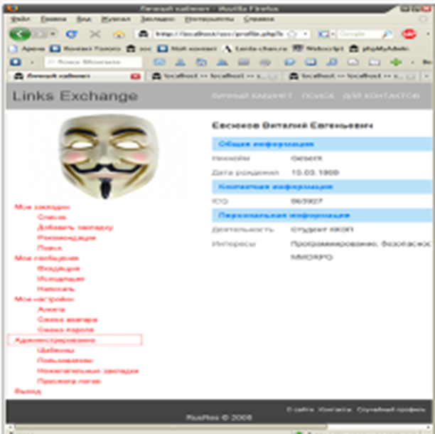 6. Код личного кабинета выглядит так: <? session_start(); $guest = false; if (!isset($_SESSION['user_id'])) { // header('Location: /soc/index.php?page='.$_SERVER["PHP_SELF"]); $guest = true; //die('Доступ закрыт, даём ссылку на авторизацию. — <a href="login.php">Авторизоваться</a>'); } include 'mysql.php'; $id = (int)$_GET['id']; if (empty($id)) { if (!$guest) $id = $_SESSION['user_id']; else $id = 0; } $same_user = false; if ($id == $_SESSION['user_id']) $same_user = true; //echo 'user: '.$same_user.' id'.$id.' sessid '.$_SESSION['user_id']; $no_user = false; //echo "select nick, fio, birth, hobbie, job, icq, filename from `user_details`, `avatars` where id={$id} and avatars.avatar_id=user_details.avatar_id"; $q = "select login from users where id = {$id}"; $r = mysql_query($q); if (mysql_num_rows($r) == 0) $no_user = true; $r = mysql_query("select nick, fio, birth, hobbie, job, icq, avatar_id from `user_details` where id={$id}"); if (mysql_num_rows($r) > 0) $ud = mysql_fetch_array($r, MYSQL_ASSOC); else { $ud = array('nick'=>'', 'fio'=>'', 'birth'=>0, 'hobbie'=>0, 'job'=>'', 'icq'=>'', 'avatar_id'=>0); } if (!$no_user) { foreach ($ud as $k => $v) { //echo $ud[$k-1].'+'.empty($ud[$k-1]); if (empty($v)) $ud[$k] = 'Нет данных'; } $ud['avatar_id'] = (int)$ud['avatar_id']; // хитрый план if (isset($ud['avatar_id'])) { $q = "select filename from avatars where avatar_id = {$ud['avatar_id']}"; //echo $q; $r = mysql_query($q); if (mysql_num_rows($r) > 0) $ava = mysql_fetch_row($r); else $ava[0] = 'avatars/anon.jpg'; } } include 'head.php'; include 'menu.php'; ?> <div id="rightCol"> <? if (!$no_user) {?> <h3><?if ($ud['fio']!='Нет данных') echo $ud['fio']; else echo 'Пользователь '.$id?></h3> <table class="profileTable" cellpadding="0" cellspacing="0"> <tbody> <tr> <td colspan="2" class="title"> Date: 2015-09-02; view: 568; Нарушение авторских прав |