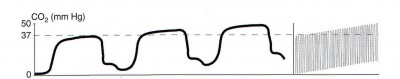 Рисунок. Спонтанное дыхание при механичекой вентиляции. Непрерывность фазы плато капнограммы при спонтанном дыхании с общим объемом достаточно большим для достижения нуля РСО2, как можно увидеть у пациентов с механической вентиляцией легких.
