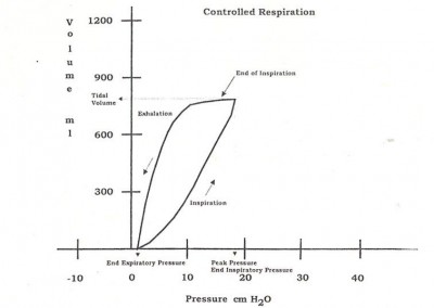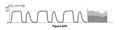 Нормальная капнограмма. A-B: выдох CO2 содержащегося в мертвом пространстве на начало выдоха B-C: экспираторный подъем кривой, представляющий опорожнение воздухоносных путей & начало опорожнения альвеол C-D: экспираторное (альвеолярное) плато, показывающее опорожнение альвеол D: уровень конечного общего объема CO2 – соответствует лучше всего альвеолярному уровня CO2 D-E: инспираторное падение кривой, когда пациент начинает вдыхать свежий воздух E-A: продолжение вдоха, когда CO2 остается на 0