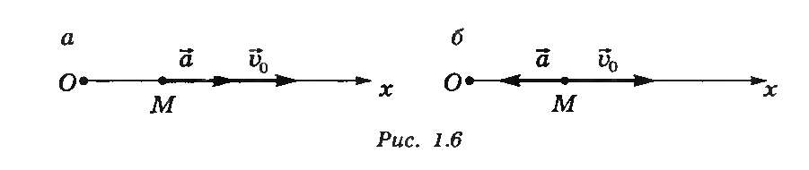 Вектор среднего ускорения имеет то же направление, что и вектор Ускорением точки в данный момент времени t называется векторная величина Ускорение точки равно нулю лишь тогда, когда скорость точки v постоянна как по величине, так и по направлению: это соответствует только прямолинейному и равномерному движению. Найдем, как располагается вектор При прямолинейном движении с возрастающей по модулю скоростью (рис. 9, а) векторы При прямолинейном движении с убывающей по модулю скоростью (рис. 9, б) направления векторов