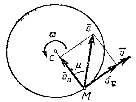 Отклонение вектора полного ускорения от радиуса описываемой точкой окружности определяется углом μ, который вычисляется по формуле
