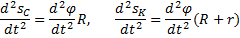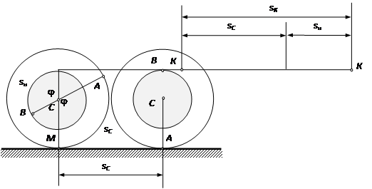 2. Из рисунка найдем связь между перемещениями. Пусть центр масс С переместился на расстояние sC. При этом точка А заняла нижнее положение, а радиус, соединяющий точки А и С повернулся на угол φ. При отсутствии проскальзывания длина дуги АМ равна перемещению центра масс. Учитывая связь между длиной дуги и углом φ, опирающимся на эту дугу, получаем