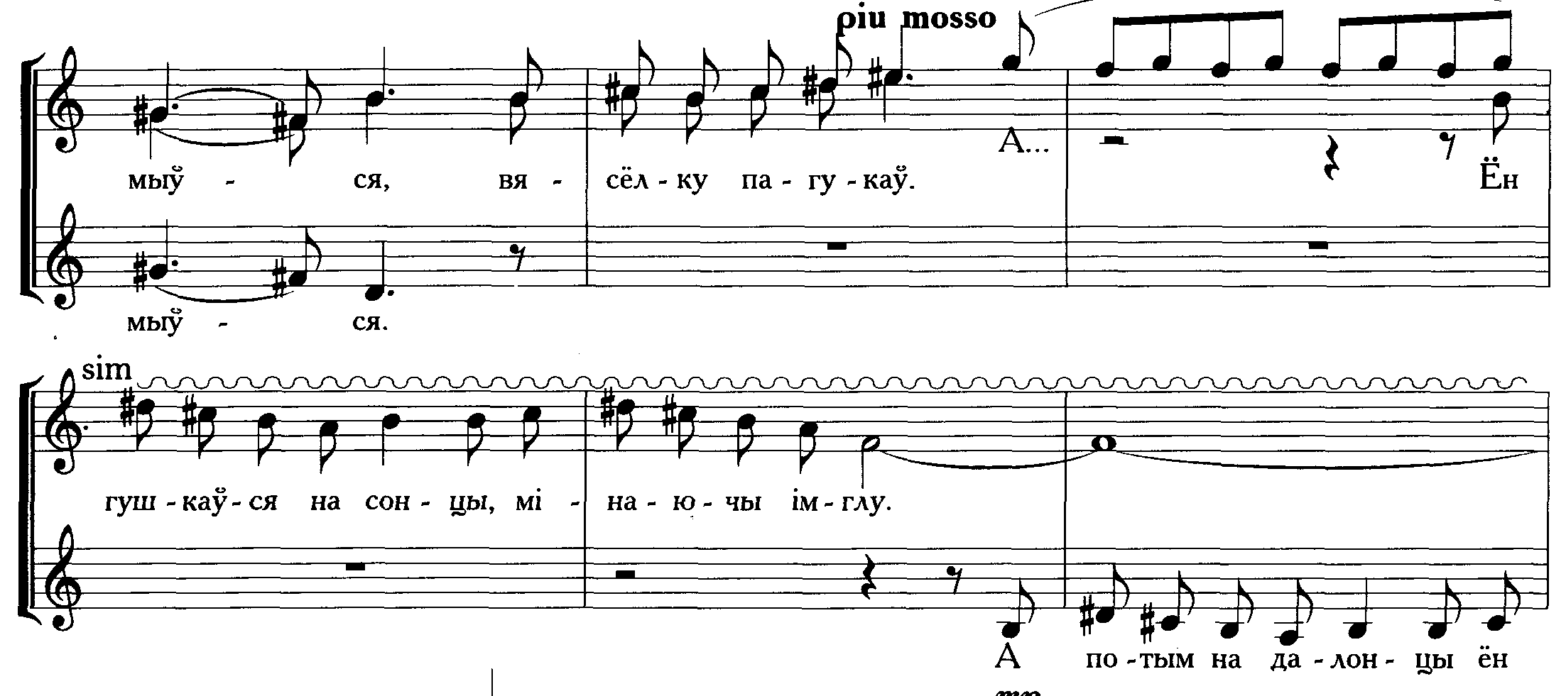 Основным приемом для разработки фактуры служит полифония - разнотемная имитационная и гетерофония. (пр. 12) В итоге в вертикали образуются увеличенные и уменьшенные аккорды, хоровой унисон. Интересными по структуре являются эпизоды с третьего по шестой такт каждого предложения. Их формирование происходит за счет поочередного подключения в каждой хоровой партии одной короткой мелодии и ее повторением во всех голосах на расстоянии полутора тона. Как результат - движение параллельными ум3/4 – аккордами. Подобное наслоение реализует смысловую сторону поэтического текста (…«I руш бясконца у яго палоне»…), что подкрепляется и метроритмом, выраженным мелкими длительностями – образ движения, суеты. Особенности музыкального языка этого хора - гибкая динамика от «mp» до «f», широкая штриховая и метроритмическая палитра (композитор в миниатюре использует длительности от шестнадцатой до половинной), характер звуковедения - от легато до стаккато. Хоровые партии выписаны удобно и, как следствие, формируется естественный ансамбль. Мелодии определенных эпизодов законченны, плавны и логичны в голосоведении.