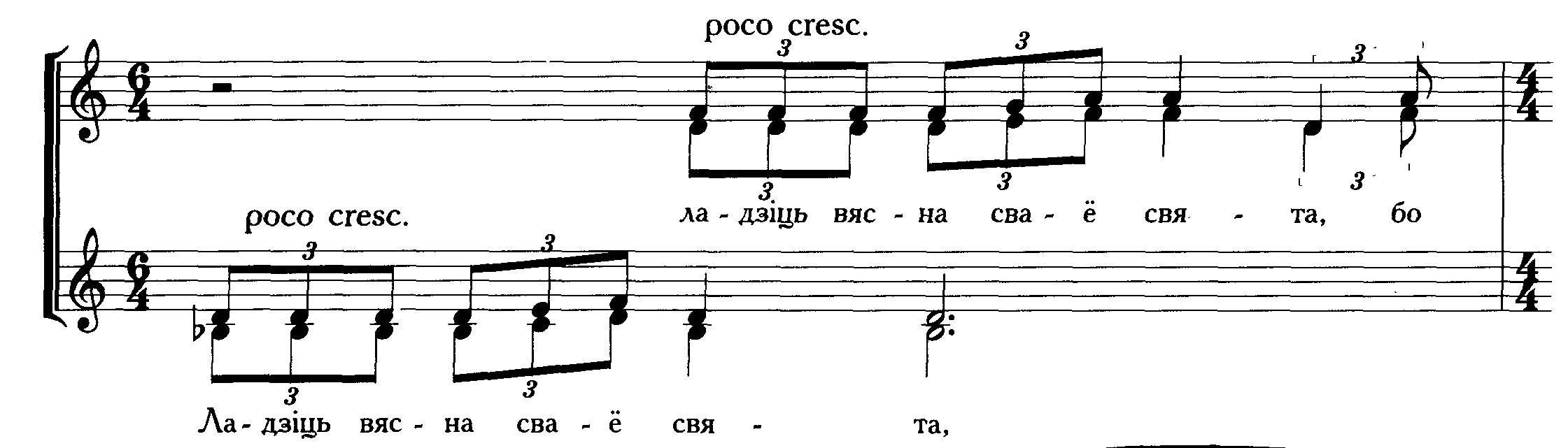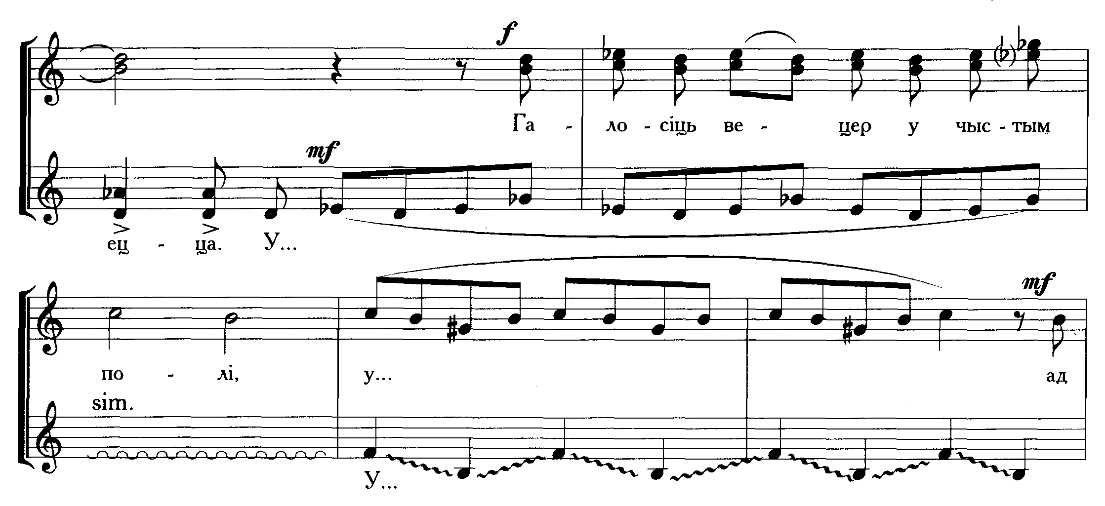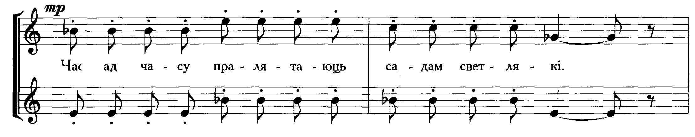 Хор начинается унисоном партии альтов. В красивую распевную мелодию, звучащую в Des-dur проникает «Ля» бекар. Это столь любимый композитором прием звукоизобразительности, риторической фигуры («заблукаў у галiнах»)..(пр. 16)