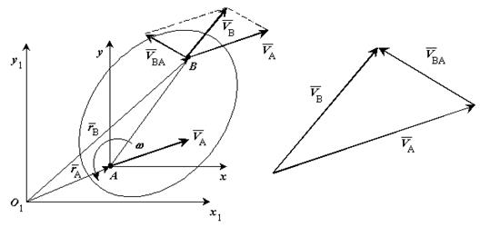 Теорема. Скорость какой-либо точки фигуры при ее плоском движении равна векторной сумме скорости полюса и относительной скорости этой точки от вращения фигуры вокруг полюса. Рис. 6-5 Применяя к плоскому движению теорему о сложении скоростей для какой-либо точки В фигуры, получаем Так как за переносное движение выбрано поступательное движение вместе с точкой А, то у всех точек плоской фигуры одинаковые переносные скорости, совпадающие с абсолютной скоростью точки А, т.е. Скорость относительного движения, в случае когда оно является вращательным движением, равна Скорость