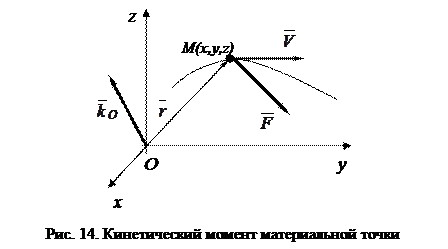 В качестве векторной меры движения часто используют понятие кинетического момента или момента количества движения. Введем это понятие. Кинетический момент материальной точки M относительно центра O – это векторное произведение радиус-вектора Рассмотрим это понятие. Пусть материальная точка M массой m, движется со скоростью