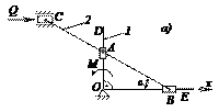 где Этот принцип применим и тогда, когда имеются связи с трением. В этом случае силу трения следует считать активной. Пример. В кулисном механизме, расположенном в горизонтальной плоскости, ползуны А и В могут перемещаться вдоль стержней OD и OE кривошипа 1, жестко соединенных между собой под прямым углом (рис. 12.4, а). Стержень 2 шарнирно связан с ползунами А, В, С. Ползун С движется по направляющим параллельно оси х. Пренебрегая трением, определить силу Q, уравновешивающую момент М. Дано: AB = AC = 1,