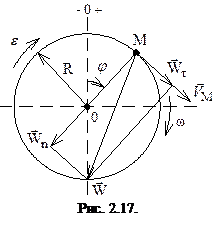 Таким образом, для определения скорости точки тела необходимо умножить угловую скорость тела на радиус, то есть расстояние точки до оси вращения. Пользуясь уравнениями (2.16)-(2.18), найдем касательное, нормальное и полное ускорения точки M: