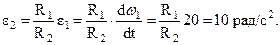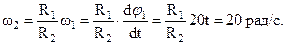 Из анализа уравнений (2.25)-(2.28) следует, что скорость и ускорение любой точки вращающегося тела пропорциональны расстоянию этой точки до оси вращения. Пример 2.8. Для передачи вращения от электродвигателя к смесителю используется плоскоременная передача, при этом на валу двигателя установлен шкив 1 радиуса R1 = 0,2 м, а на валу смесителя шкив 2 радиуса R2 = 0,4 м (рис. 2.18).