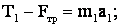 Решение. Рассмотрим движение каждого груза отдельно. На первый груз действуют: По условию задачи вектор ускорения для первого груза направлен вверх по наклонной плоскости. Запишем для первого груза уравнение второго закона Ньютона в векторной форме: Направим ось Х вверх по наклонной плоскости, ось У1 – перпендикулярно к ней. Проецируя уравнение (1) на выбранные направления осей Х и У1, получаем: Из уравнения (3) находим, что Подставляя выражение (4) в уравнение (2), получаем: На второй груз действуют: Ось У2 направим вертикально вниз. Спроецировав уравнение (6) на ось У2, получим: Сложив почленно уравнения (5) и (7), получим: Учитывая, что Т1 = Т2 = Т и а1 = а2 = а, находим: Силу натяжения нити определим из уравнения (7): Ответ: ускорение движения тела а = –1,93 м/с2; сила натяжения нити Т = 15,74 Н. Полученные ответы справедливы только в том случае, если телоm1 двигалось вверх по наклонной плоскости. Если же в начальный момент тела были неподвижны или двигались в противоположном направлении, задачу следует переделать, так как направление силы трения при таком движении изменяется на противоположное.