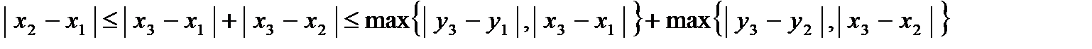 2. Метрика .Это двумерное арифметическое пространство с супремальной метрикой. Первые аксиомы очевидны. Проверим третью аксиому. Рассмотрим точки , , и докажем следующее неравенство: .