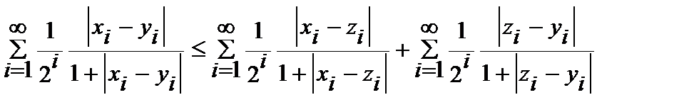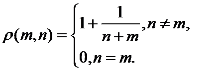 3. Показать, что пара метрическое пространство, если метрика на носителе натуральных числах задана так: Неравенство треугольника для несовпадающих точек очевидно: . В этой метрике при то есть натуральные числа чем дальше они расположены на числовой оси, тем ближе по метрике .