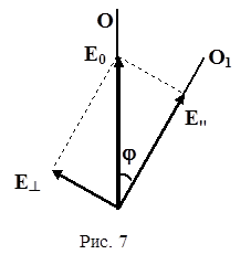 Допустим, что два поляризатора поставлены друг за другом так что их оси О и О 1 образуют некоторый угол j (рис. 6). На первый поляризатор падает естественный свет интенсивности I ес т , он пропускает колебания электрического вектора параллельные оси О амплитуда которых Е 0 и интенсивность I 0. Второй поляризатор (анализатор) пропускает колебания электрического вектора параллельные оси О 1 амплитуда которых Е и интенсивность I. Разложим Е на вектор Е