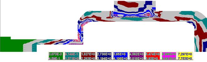 Можем сделать заключение, что данная конструкция при указанных условиях нагружения (p =20 МПа) не является прочной. Условия прочности нарушаются в пластмассовой детали корпуса в зоне канавки, а так же вблизи переднего сужения того же корпуса.