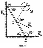 Нетрудно определить направление вектора скорости точки А, скользящей по вертикальной прямой. Тогда находится на пересечении перпендикуляров к и (рис. 37).